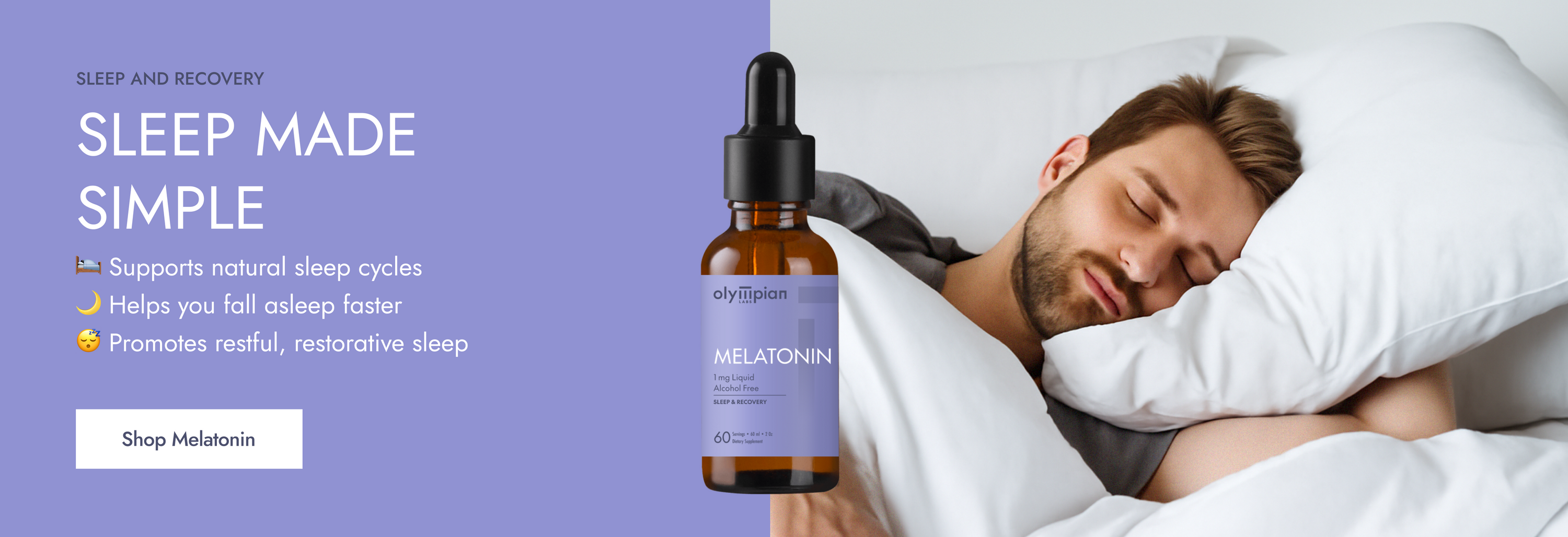 Olympian Labs Melatonin supplement bottle with features listed on a blue background