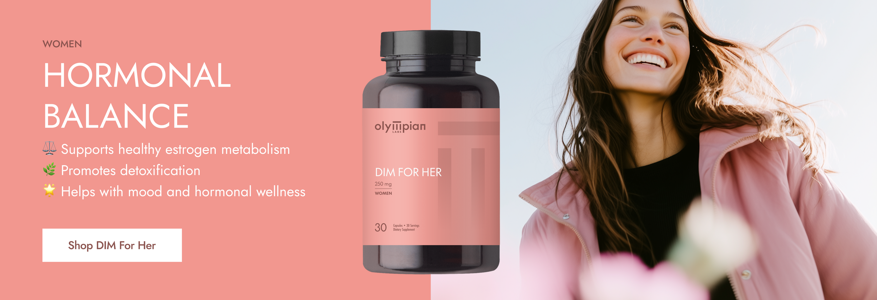 Black supplement bottle labeled 'olympian' with 'DIM 250' on a white background